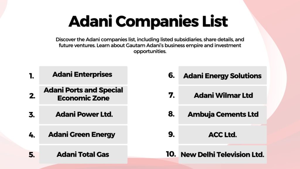 Here’s the complete Adani companies list 2025, covering every major firm owned and operated by the Adani Group of Companies. These companies operate across various sectors, including energy, ports, infrastructure, logistics, cement, media, and FMCG.