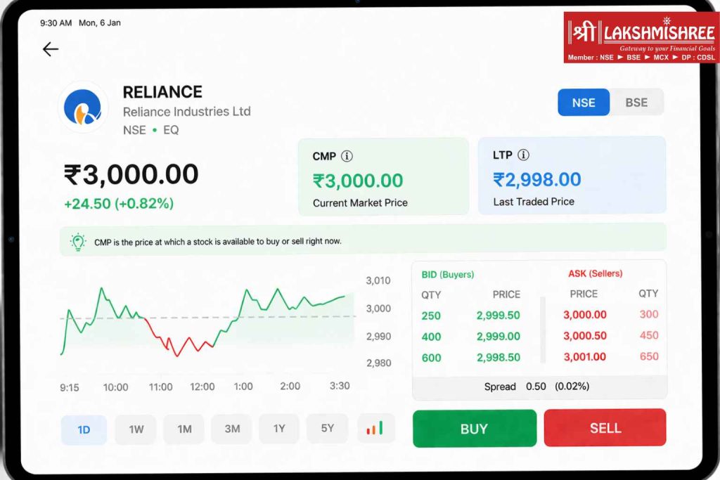 When you place a buy order at CMP on your Lakshmishree trading terminal, the system fetches the live-wire price directly from the NSE/BSE feed.