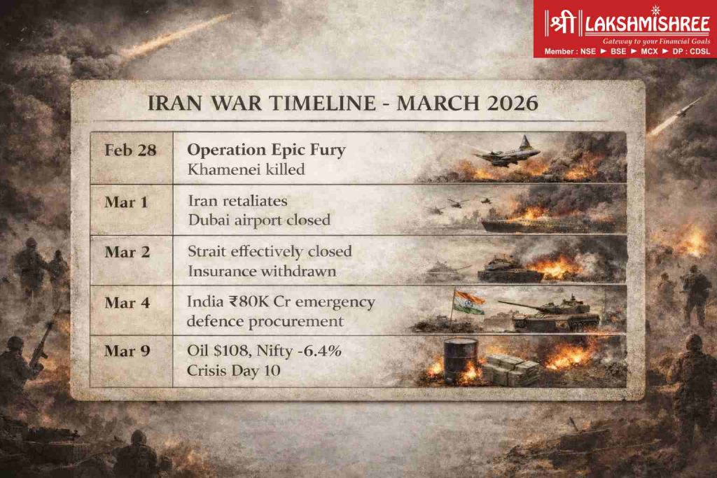 Disclaimer: Iran war analysis based on real-time data as of March 9, 2026. Oil, commodity, stock prices subject to rapid change based on conflict developments. Scenario probabilities represent Lakshmishree assessment, not guarantees. Portfolio allocations are general guidance, individual circumstances vary. Defence stocks carry high volatility risk. Commodities can crash rapidly on ceasefire. Historical war-market patterns don't guarantee future outcomes. This is educational content, not personalized investment advice. Consult SEBI-registered advisor before making investment decisions. All investments carry market risk. Lakshmishree Investment and Securities is SEBI registered stockbroker providing investment services.