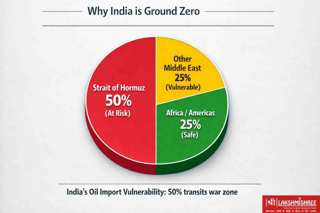 India imports 85% of its crude oil i.e. 4.2 million barrels daily. Of this, 50% transits Strait of Hormuz. Bloomberg, Goldman Sachs, and Societe Generale all label India "most at risk" in Asia from this war. Here's why: