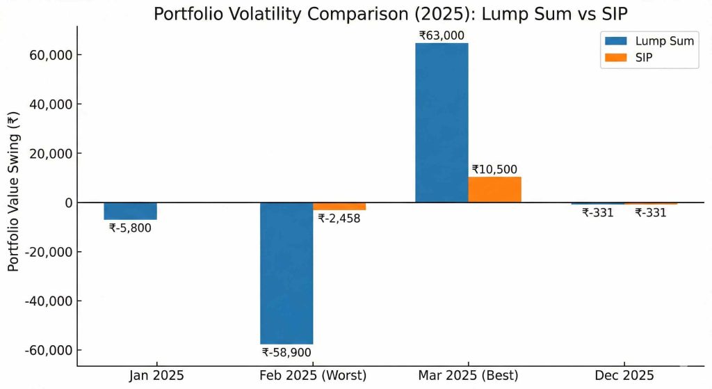 In 2025’s rising market, lump sum’s immediate full exposure advantage outweighed SIP’s cost-averaging benefit. The ₹42,700 difference came from the 12 months where your full ₹10 lakh was working in lump sum, but only ₹5,41,666 was deployed in SIP.