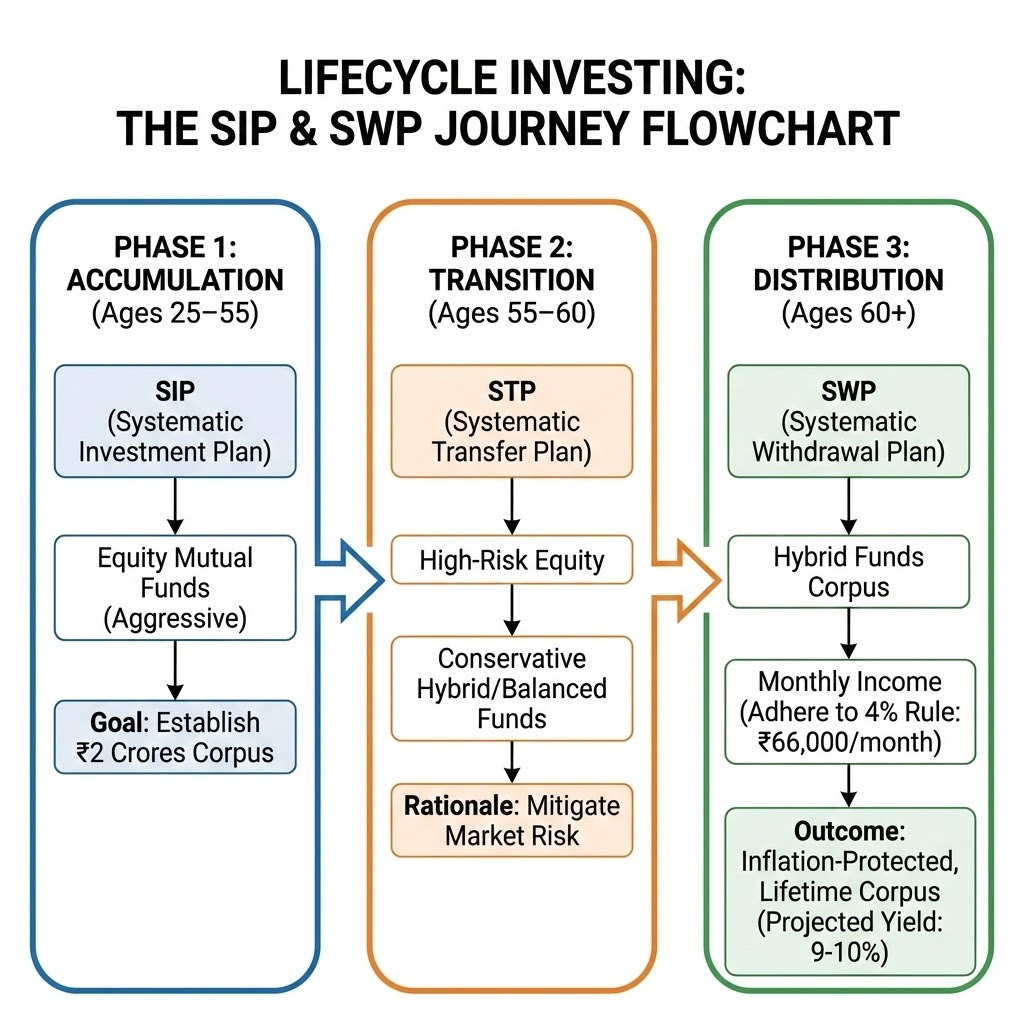 Use a Systematic Transfer Plan (STP) to move funds from high-risk Equity to conservative Hybrid/Balanced Advantage Funds. This de-risks the portfolio pre-retirement.