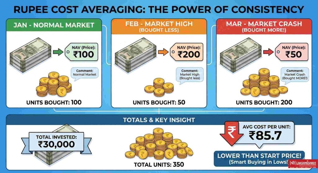 The SIP mechanism benefits from rupee cost averaging. When the market falls, the fixed investment amount buys more units. This lowers the average purchase cost over time. A fluctuating, even declining, market allows the investor to "buy cheap units," which is essential for maximizing long-term returns.