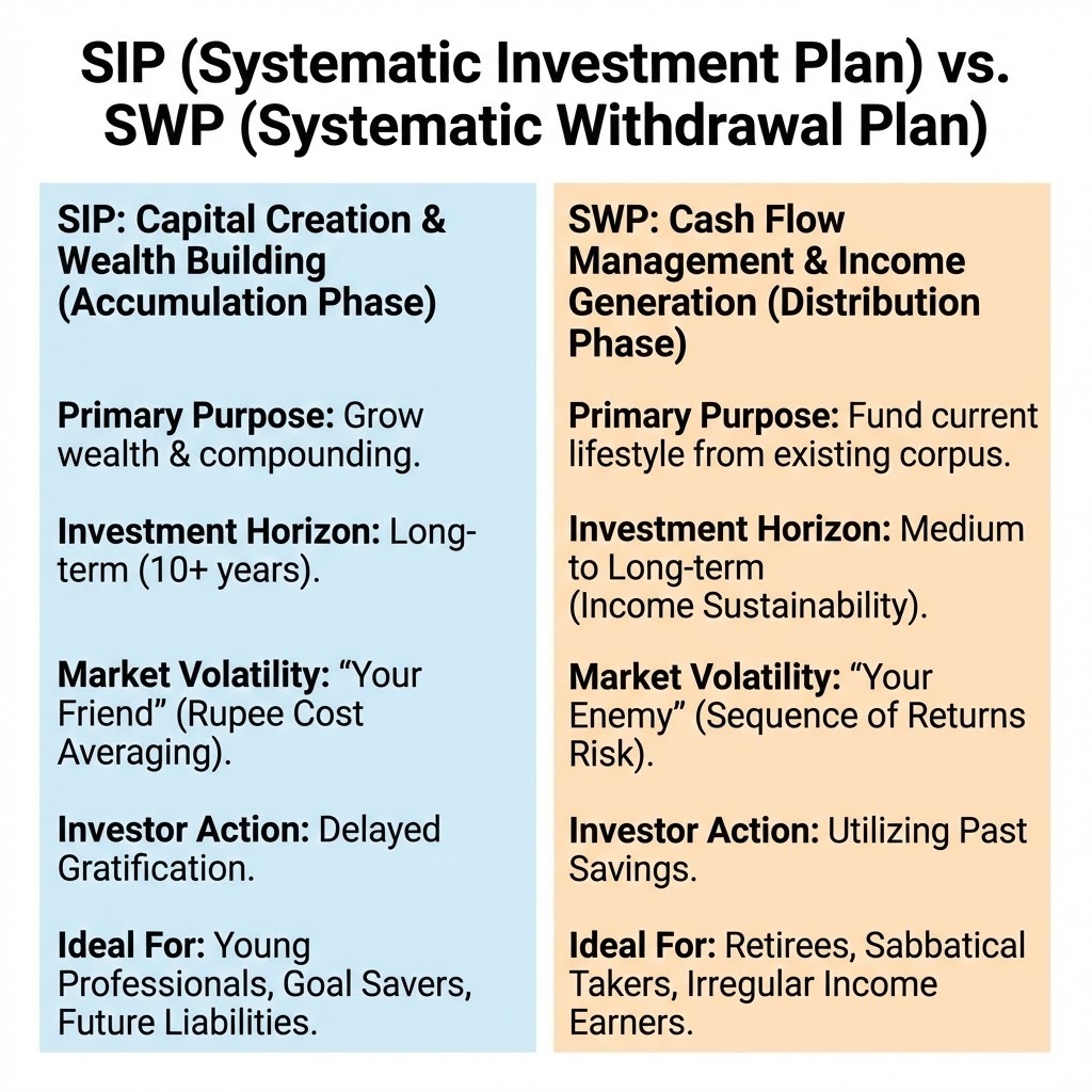 • SWP: Best suited for individuals in the Distribution Phase of their financial life: Retirees needing a regular income from their retirement corpus; Sabbatical Takers or individuals with temporary career breaks who need to draw from savings for a fixed period; Freelancers or Business Owners with highly irregular income, who may invest a lump sum during high-income months and use an SWP during low-income months for stability.