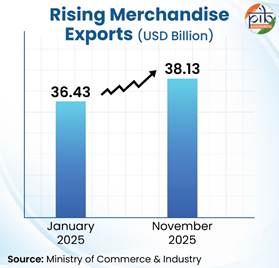 India’s trade performance improved steadily through 2025, despite global demand headwinds. Merchandise exports rose from USD 36.43 billion in January to USD 38.13 billion in November, supported by strong shipments of engineering goods, electronics, pharmaceuticals, petroleum products, and agricultural exports.