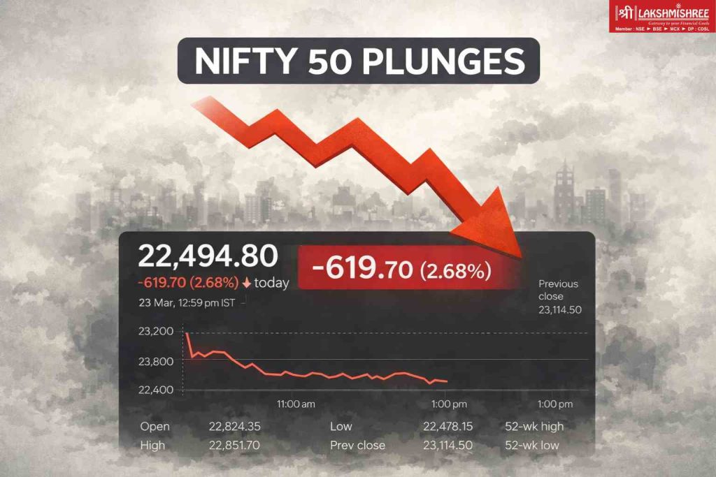 March 23, 2026 — Indian equity markets witnessed a sharp sell-off on Monday (Black Monday), with the BSE Sensex plunging over 1,900 points and the Nifty 50 slipping below the crucial 22,500 level in afternoon trade, as escalating geopolitical tensions, a weakening rupee and broad-based selling weighed heavily on investor sentiment.